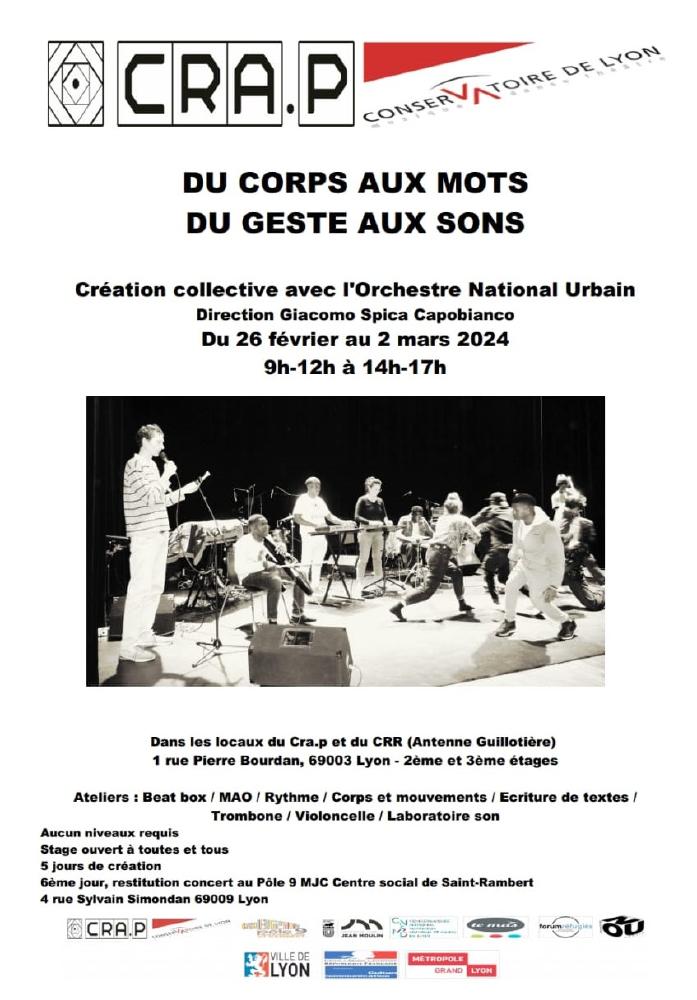 L’Orchestre National Urbain, sous la direction de Giacomo Spica Capobianco, réunit des personnalités artistiques de divers horizons (rap, slam, classique, jazz, électro, musiques traditionnelles, danse) et propose, sous forme d'ateliers de création collective, de faire travailler des personnes sur une durée d'une semaine et plus, jusqu'à obtenir une restitution des travaux.