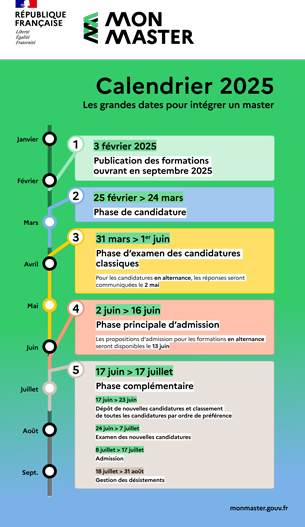 3 – 31 mars au 1er juin 2025 : phase d'examen des candidatures "classiques" →  Pour les candidatures en alternance : réponses à partir du 2 mai 2025