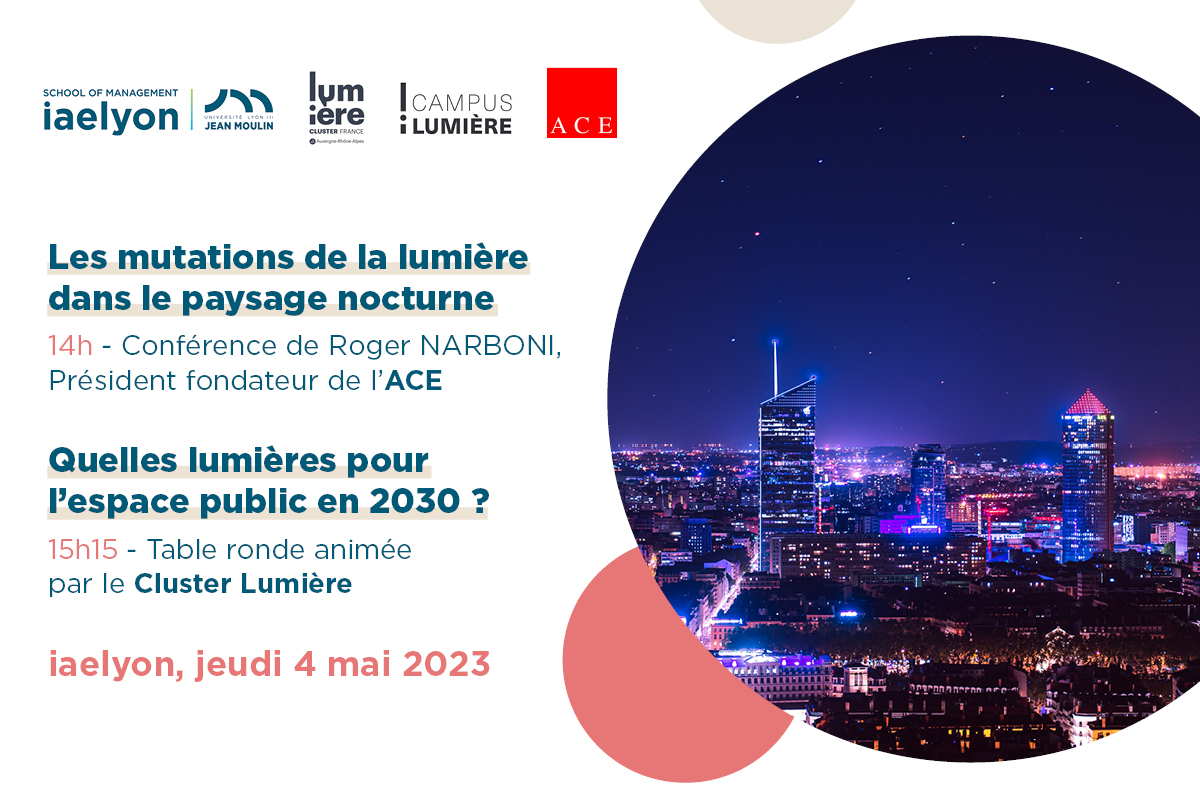 Conférence ? Les mutations de la lumière dans le paysage nocturne ? avec Roger NARBONI (Concepto, ACE), suivie d’une table ronde ? Quelles lumières pour l’espace public en 2030 ? ? animée par Philippe BADAROUX (Président du Cluster Lumière). Evénement organisé par l’iaelyon, le Cluster Lumière, le Campus Lumière et l’ACE.
