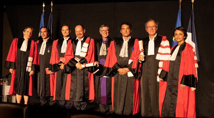 De g. à d. : Mathilde PHILIP-GAY, professeure de droit public ; Hervé de GAUDEMAR, Doyen honoraire de la Faculté de Droit; Olivier GOUT, Doyen de la Faculté de Droit; Philippe SANDS, Docteur honoris causa de l'Université Jean Moulin; Olivier DUGRIP, Recteur de l'Académie de Lyon ; ?ric CARPANO, président de l'Université Jean Moulin; Johannes MASING, Docteur honoris causa de l'Université Jean Moulin ; Frédérique FERRAND, professeure de droit privé.