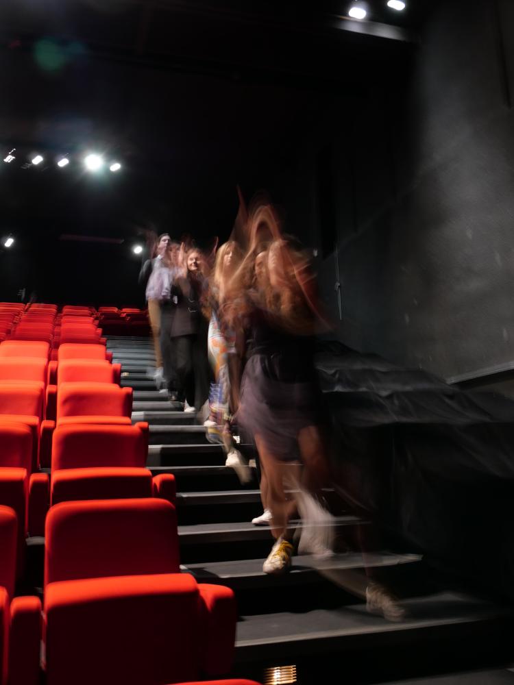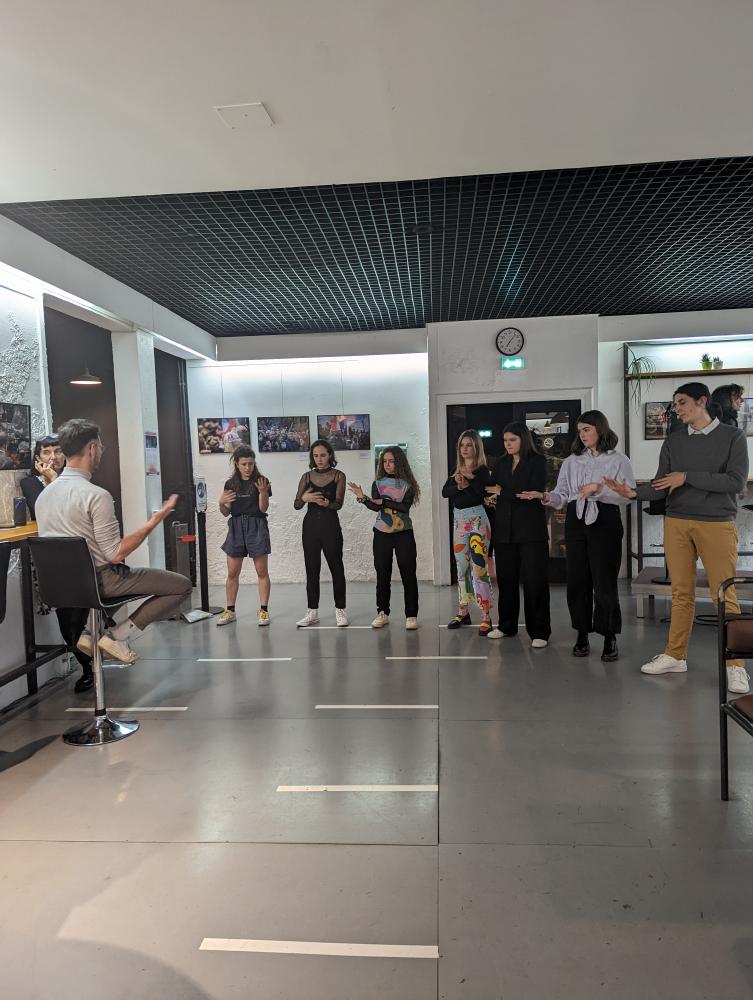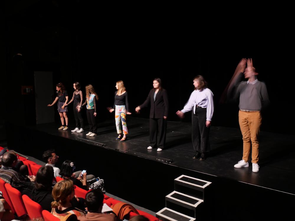 Printemps 2022Les étudiants ont investi le hall du thé?tre avec leur corps, comme un vrai terrain de jeu, danser au milieu du public qui attend pour récupérer ses billets, rendre hommage à Pina Bausch et sa Nelken Line sur les marches du thé?tre du Point du Jour, en attendant les retardataires, chansigner une chanson fran?aise kitch et célèbre des années 70 et signer quelques phrases d’un poème écrit par un artiste sourd, Anthony Guyon.