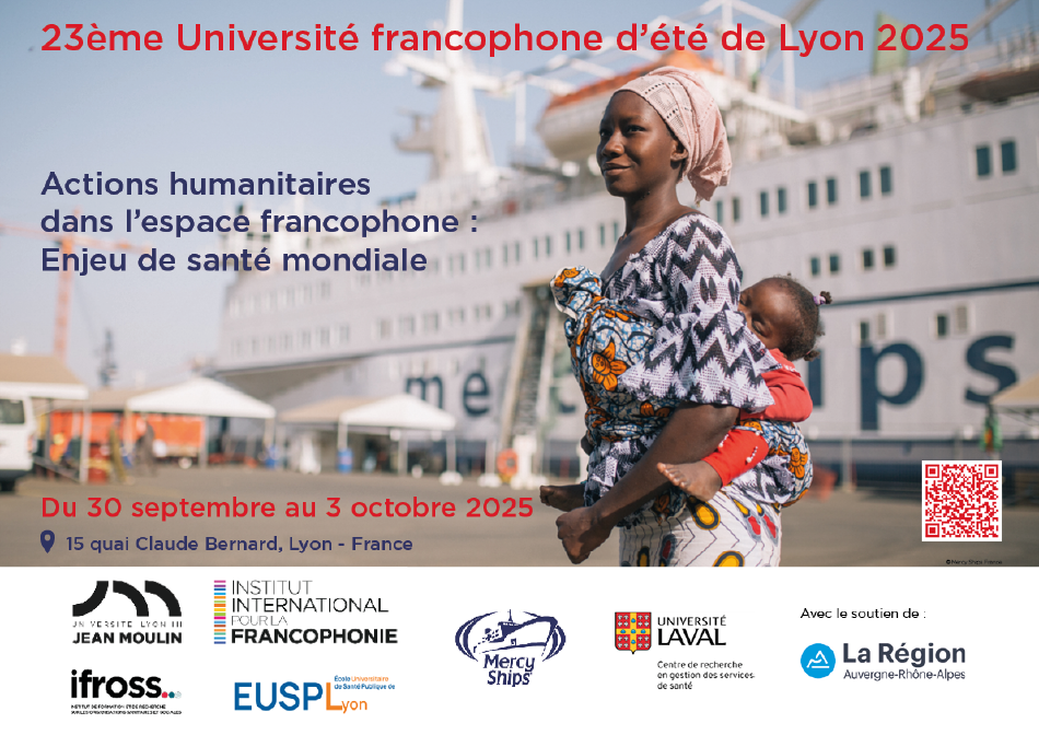 Organisée par l’Institut International pour la Francophonie (2IF) de la Direction des Relations Internationales de l’Université Jean Moulin Lyon 3, la 23ème Université francophone d’été de Lyon 2025 se déroulera du mardi 30 septembre au vendredi 3 octobre 2025 et portera sur le thème : ? Actions humanitaires dans l’espace francophone : Enjeu de santé mondiale ?